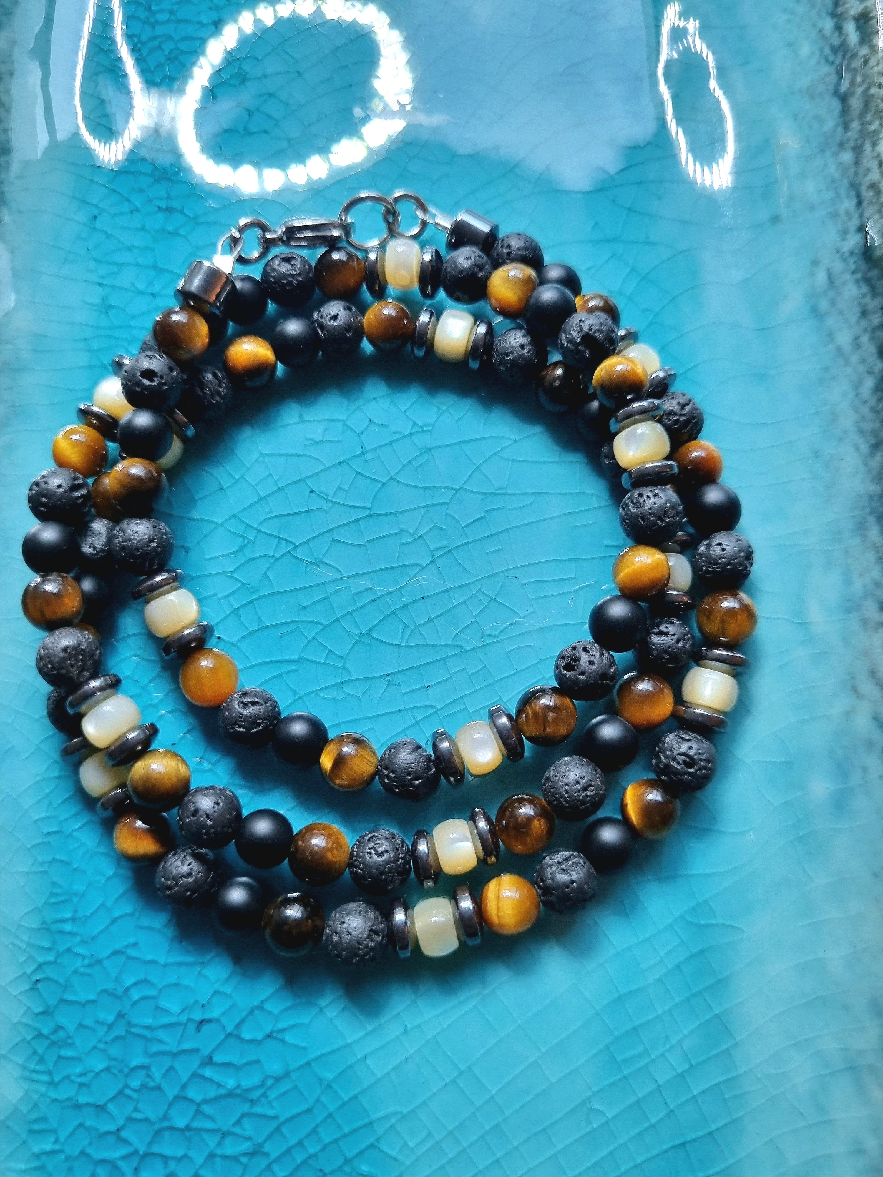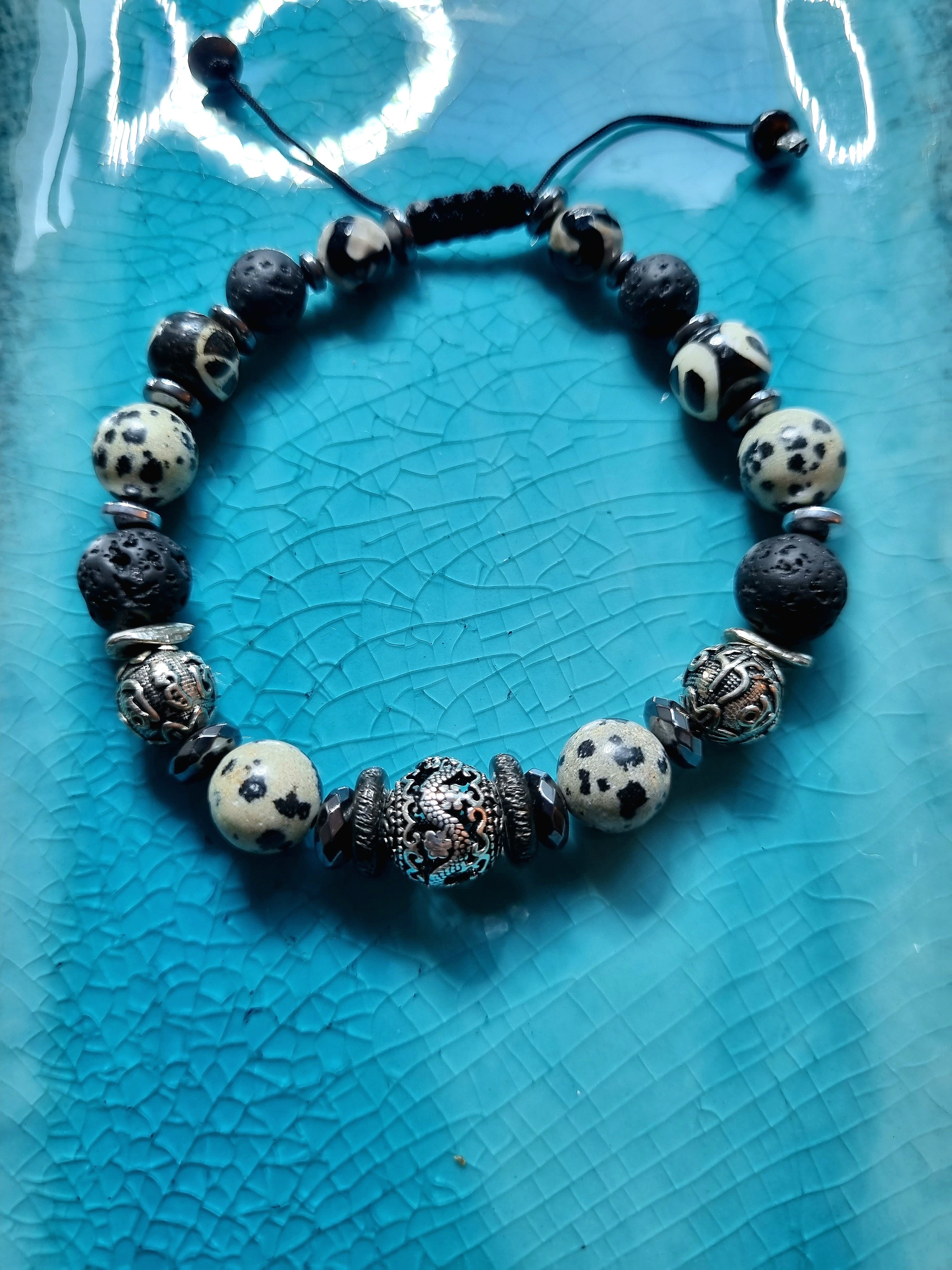Semi previous beads bracelets mounted on a silk thread; Adjustable macramé clasp. Each piece is unique, combining vibrating gemstones, bones, engraved wood and vintage silver beads.