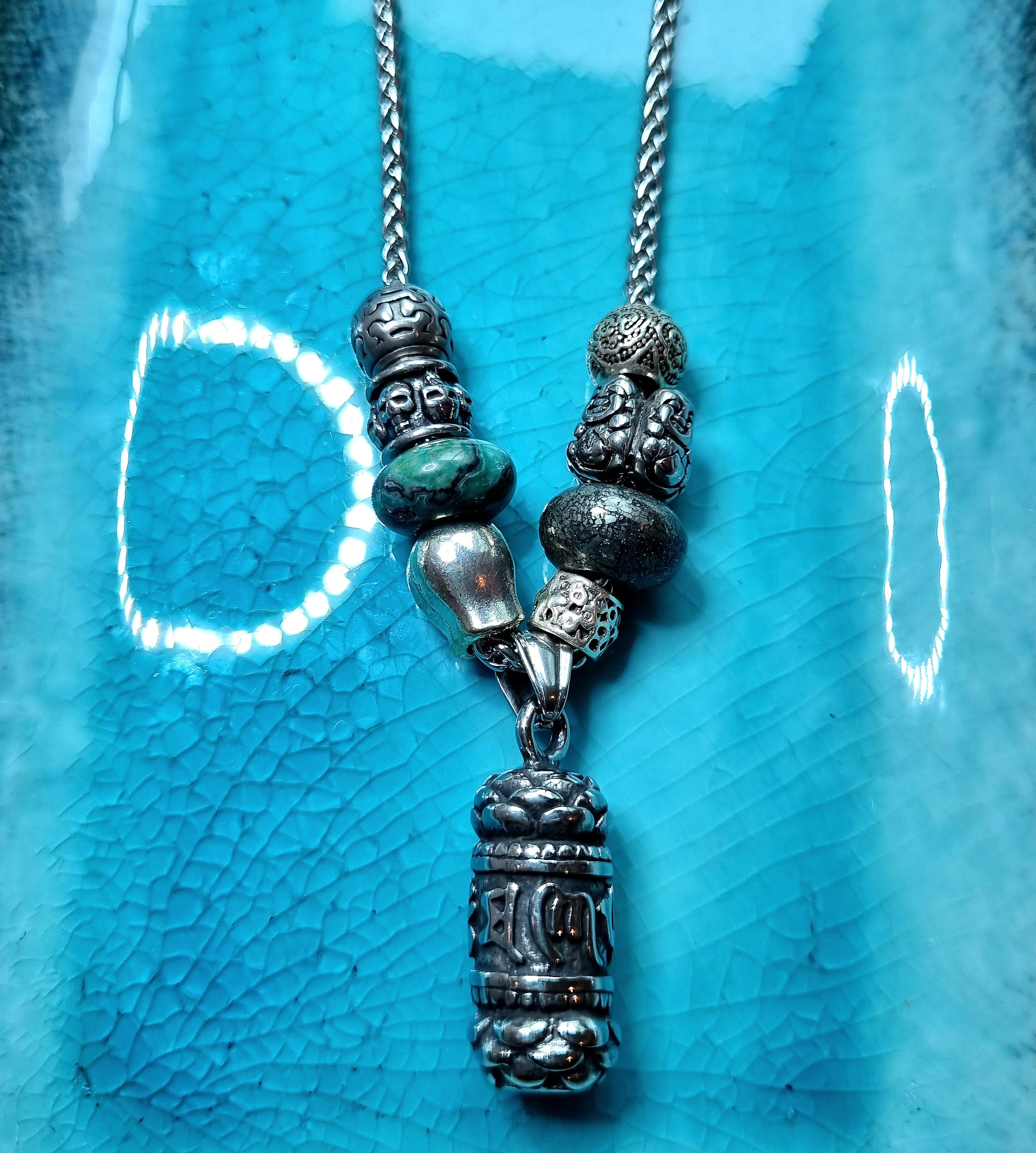 Man Tibetan silver pendants mounted with gemstone beads on a snake chain.