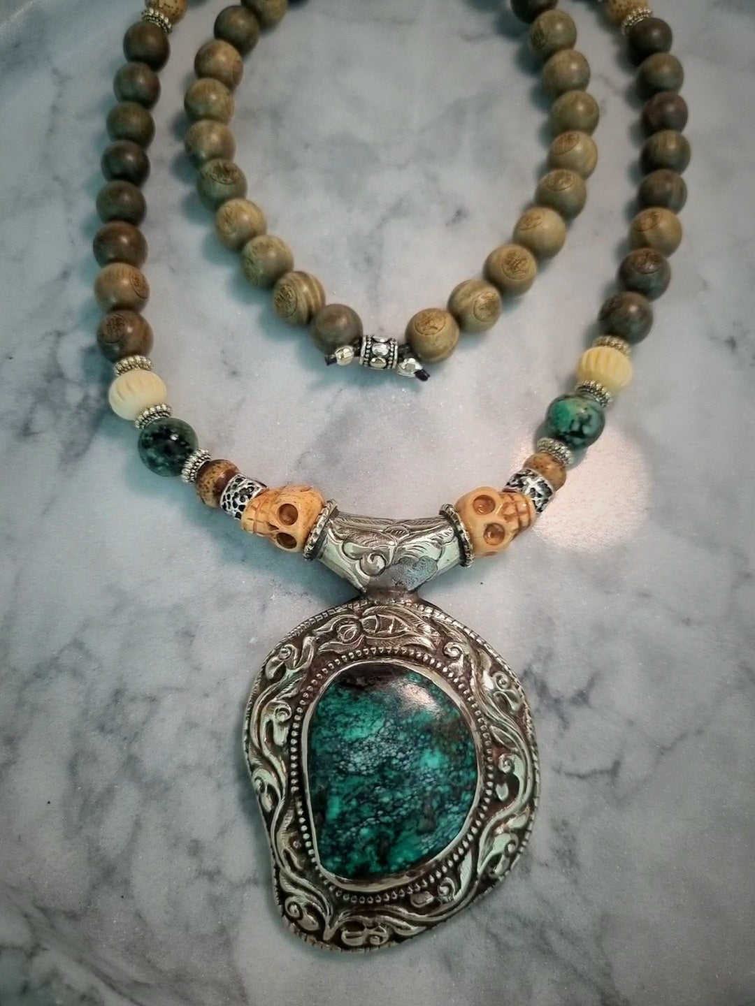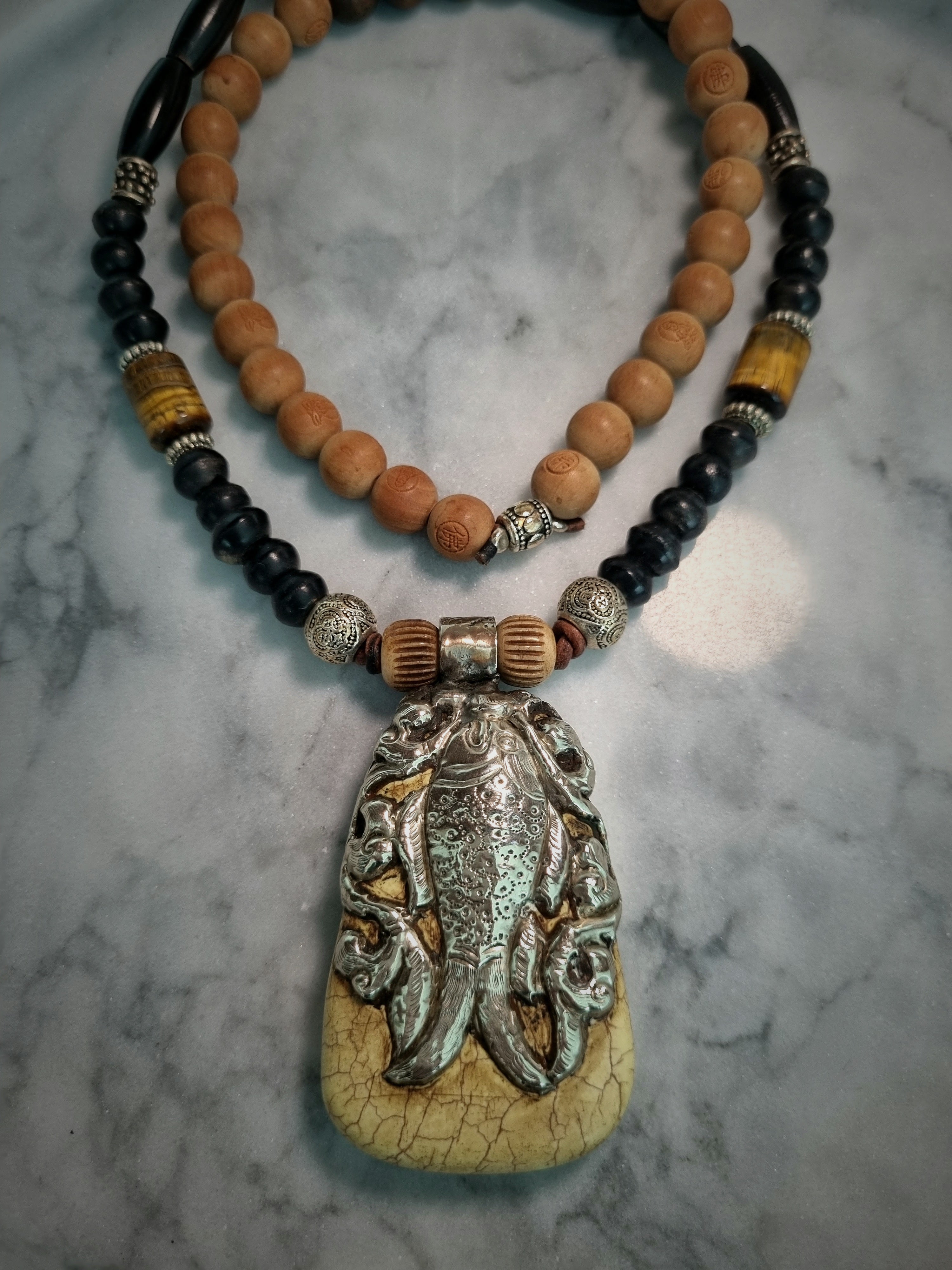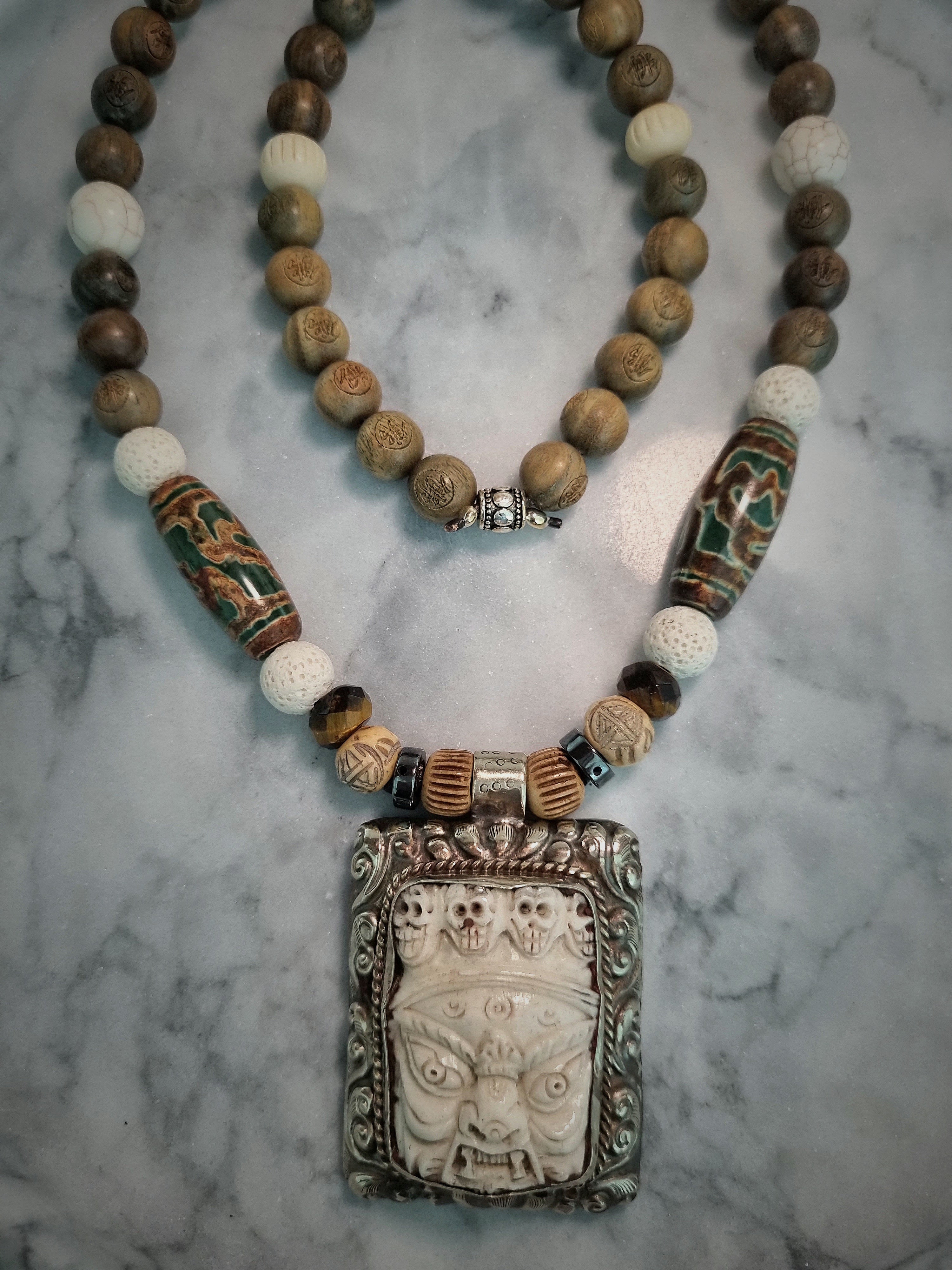 Man Tibetan rosary made of engraved Om prayer sandalwood beads mounted on a leather thread with Tibetan silver pendants.